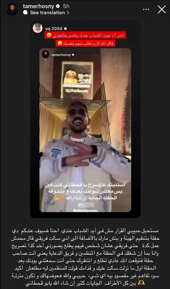 ووجه سعد القحطاني رسالة إلى تامر حسني قائلاً: "أنا جيت لكن الشباب عندك رفضوا يطلعوني، وقالوا لي لازم أنت تطلب منهم بنفسك"، وهو ما تفاعل معه الفنان المصري بالرد مباشرة.