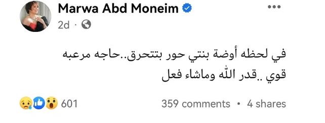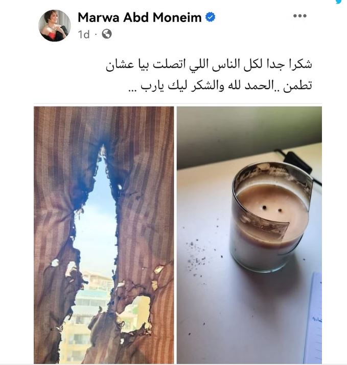 ونشرت عبدالمنعم صورا لما خلّفه الحريق من آثار، وكتبت: “شكرًا جدًا لكل من اتصل بي للاطمئنان. الحمدلله والشكر لك يا رب”. ووصفت حالة الرعب لحظة نشوب الحريق في منشور: “في لحظة اشتعلت غرفة ابنتي حور. أمر مرعب جداً. قدر الله وما شاء فعل”. وعن أسباب الحريق، قالت الممثلة المصرية في تصريحات لوسائل إعلام محلية: “كانت ابنتي مشغلة المروحة في الغرفة وتركتها ونامت، ما حرك النار فلامست الستارة، واشتعل الحريق في الغرفة”. وأضافت “الحمدلله أنني دخلت في الوقت المناسب، لأن ابنتي استيقظت على منظر النار المشتعلة. ولو تأخرت قليلاً، كان سينتهي الأمر بحادثة كبيرة. وكلنا بخير الحمدلله، إلا أن الموقف كان مرعبًا”.
