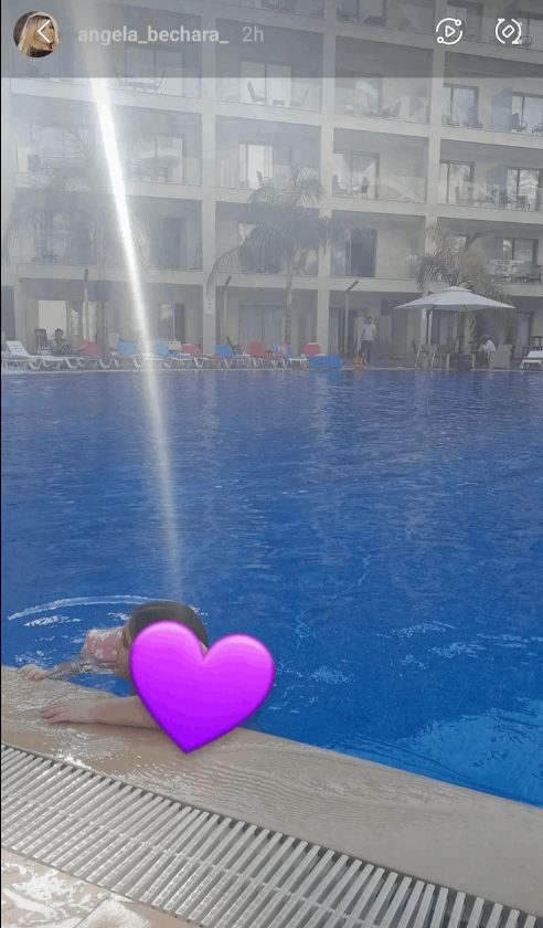 بشارة من داخل حوض السباحة، حيث عمدت والدتها إلى عدم إظهار وجهها بشكل واضح، واضعة اشارة قلب على جزء من الصورة.