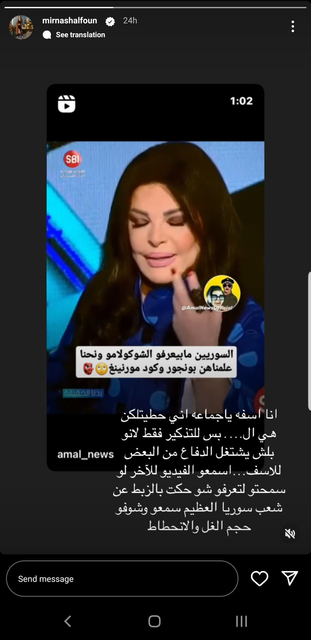 وكتبت ميرنا في تعليقها على الفيديو: "اسمعوا الفيديو للأخير لتعرفوا ما حكته عن شعب سوريا العظيم، سمعوا وشوفوا حجم الغل والانحطاط".
