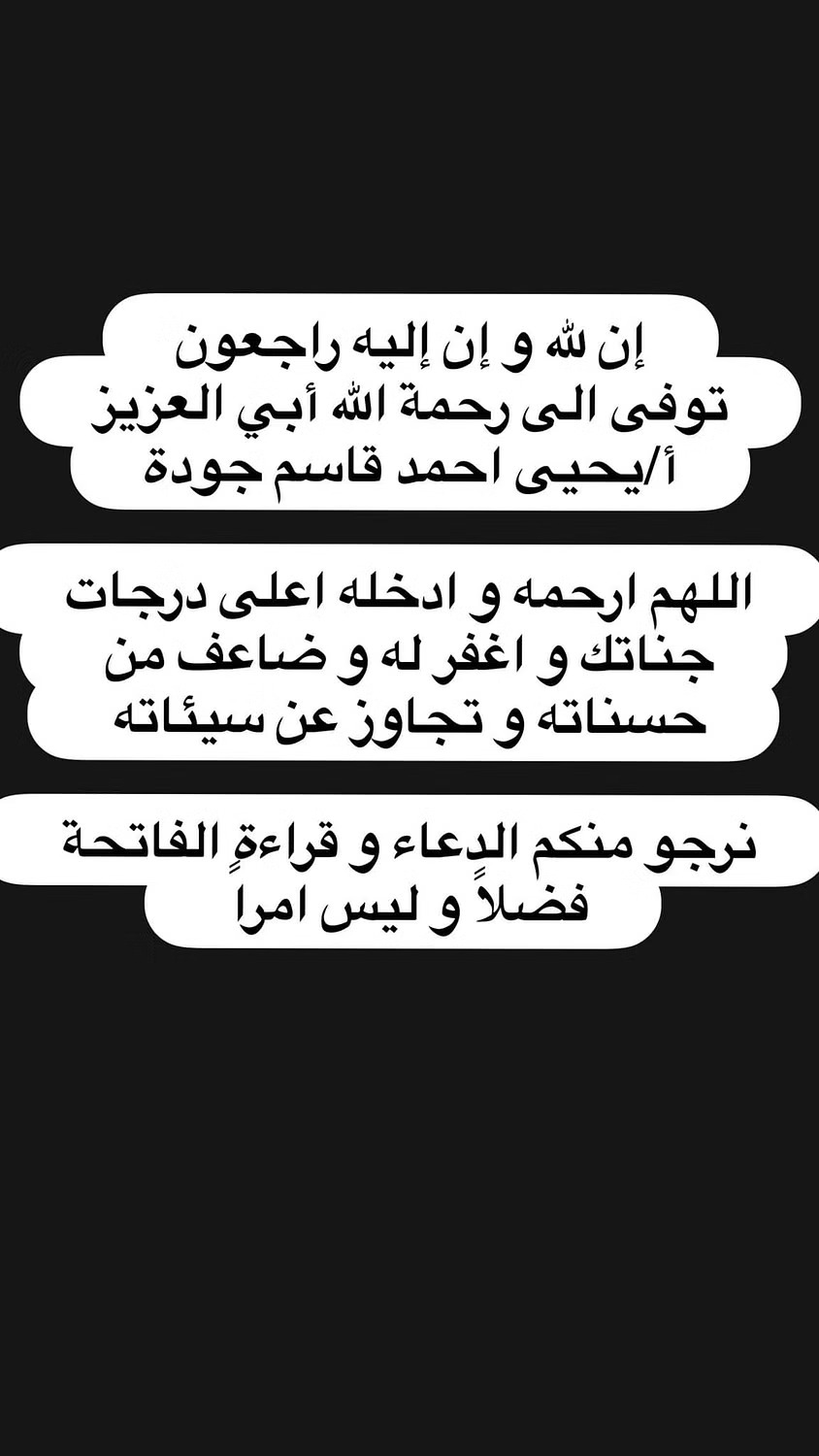 وطلبت أروى من الجميع الدعاء له وقراءة الفاتحة على روحه: "نرجوا منكم الدعاء وقراءة الفاتحة، فضلا وليس أمرًا".