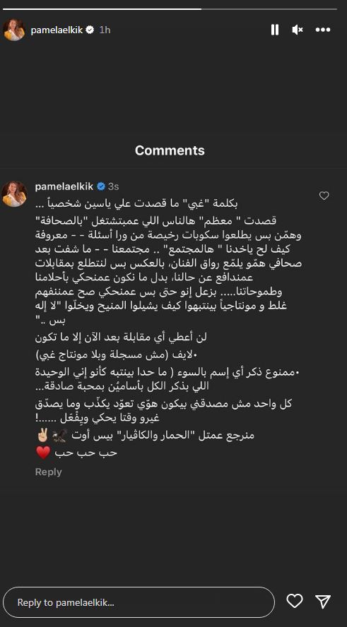 كلمة باميلا تلك عرضتها للانتقاد والهجوم، لتخرج عن صمتها وترد موضحة انها لم تقصد
