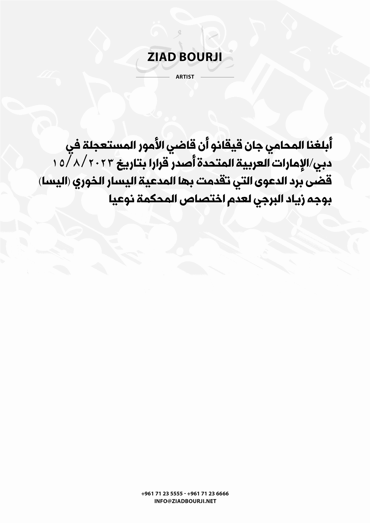 وقد صدر عن زياد برجي بيانا يكشف التفاصيل، جاء فيه: "أبلغنا المحامي جان قيقانو، ان قاضي الامور المستعجلة في دبي/الامارات العربية المتحدة، اصدر قرارا بتاريخ 15/8/2023، قضى برد الدعوى التي تقدمت بها المدعية اليسار الخوري (اليسا) بوجه زياد البرجي لعدم اختصاص المحكمة نوعيا".