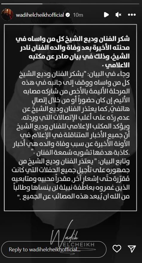 ونشر وديع عبر خاصية القصص المصورة عبر انستغرام بيانا، شكر من خلاله كل من واساه بمصابه واعتذر عن عدم تمكنه من الرد على الجميع.