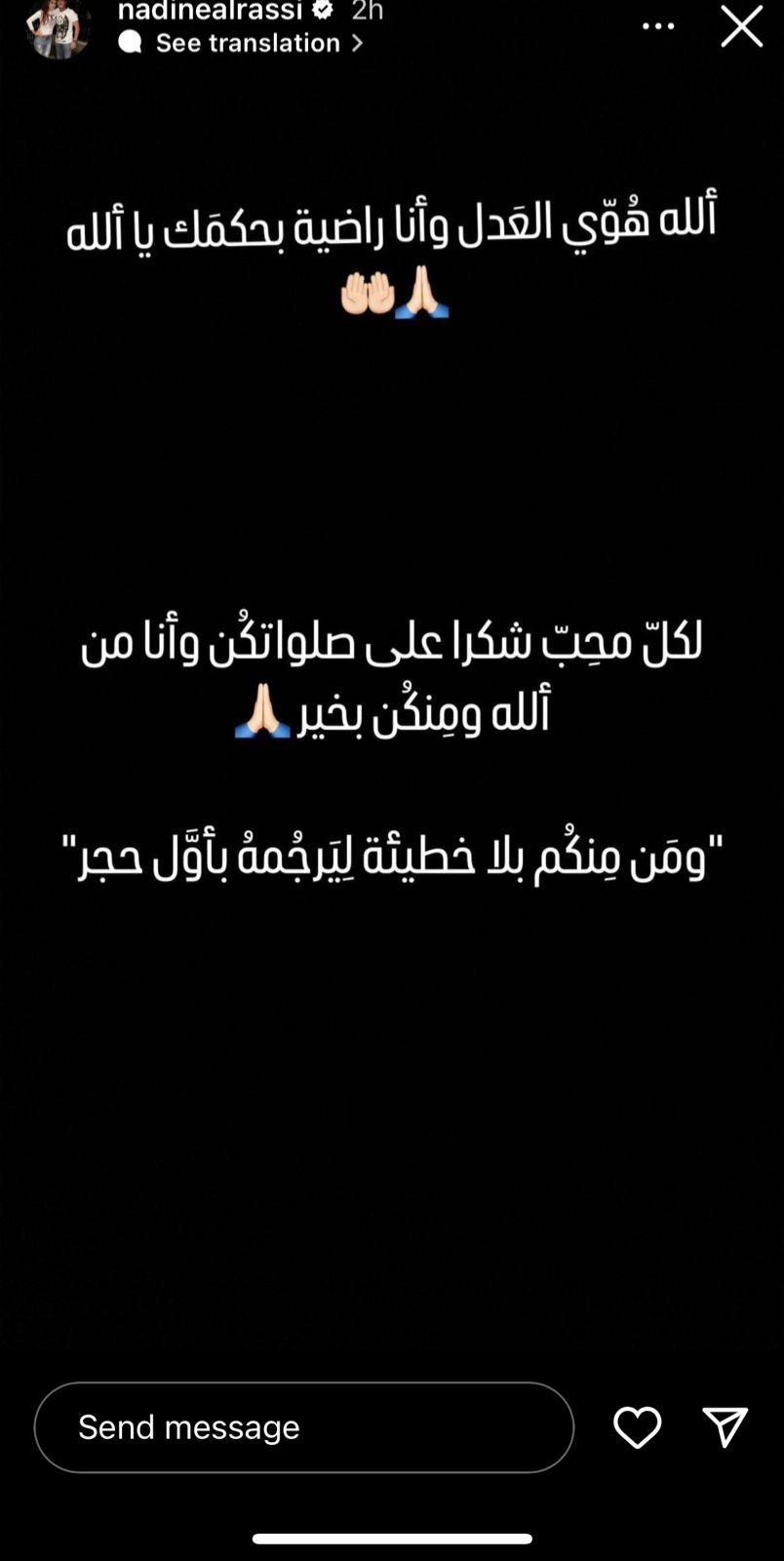 وفي التفاصيل، نشرت نادين الراسي عبر خاصية القصص القصيرة على حسابها الرسمي عبر انستغرام تدوينة قالت فيها: "الله هوي العدل وأنا راضية بحكمك يا الله".