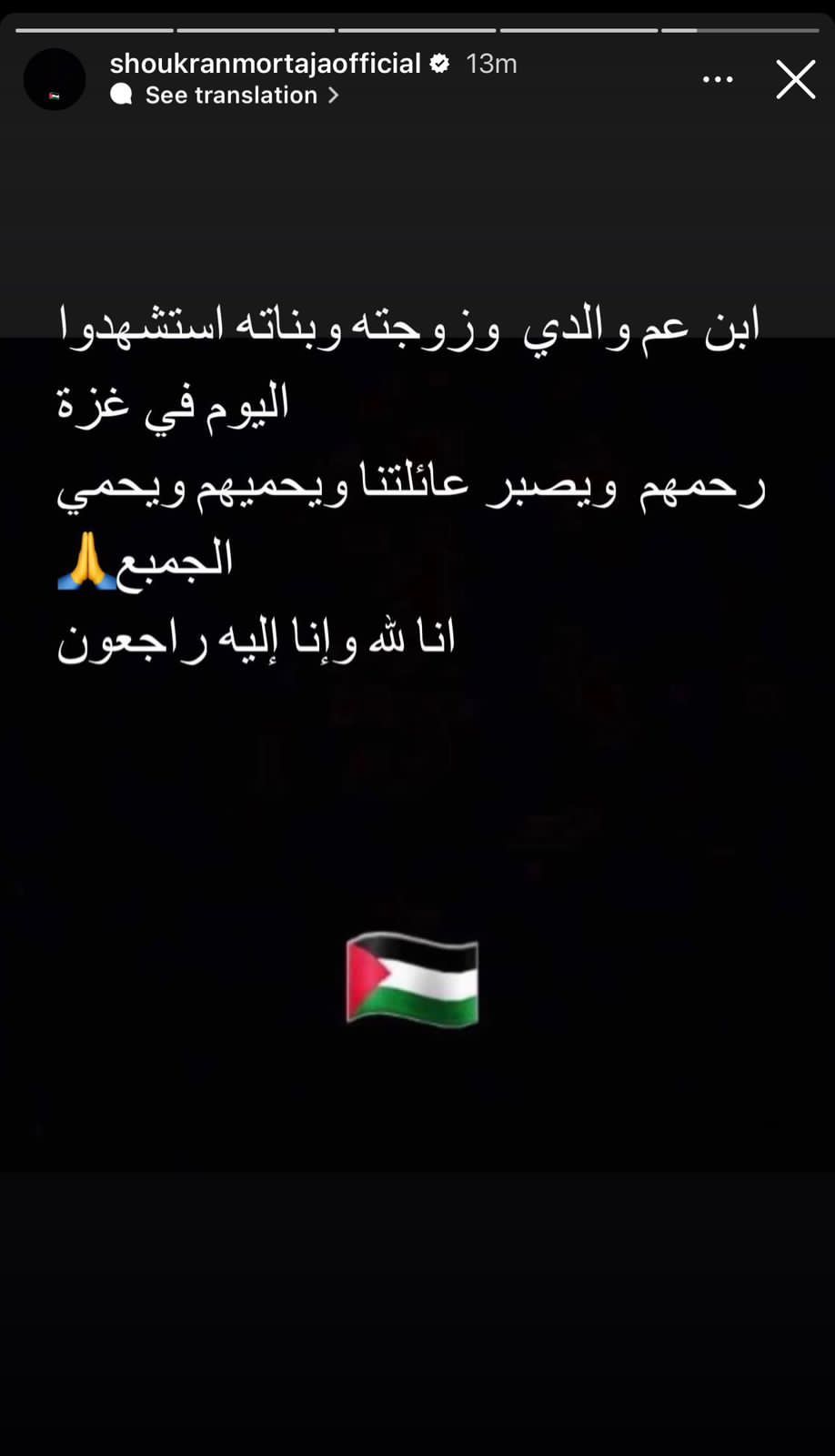 شكران مرتجى عبر خاصية القصص القصيرة على حسابها عبر "انستغرام"، تدوينة وكتبت: "ابن عم والدي وزوجته وبناته استشهدوا
