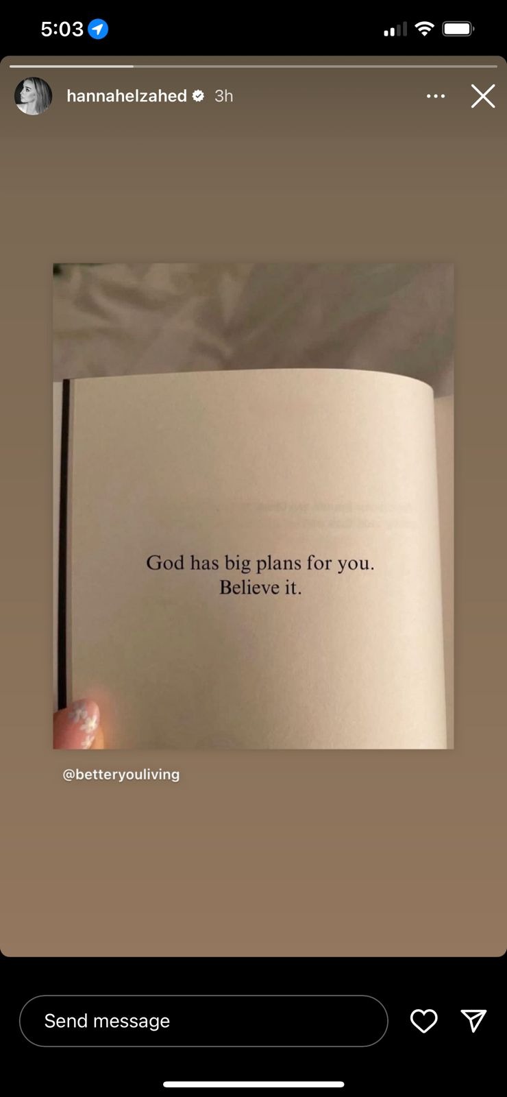 وفي التفاصيل، نشرت هنا مقولة عبر خاصية القصص القصيرة على حسابها عبر انستغرام، تؤكد أنها تصدق أن الله يحفظ لها في المستقبل الخطط الكبيرة والعظيمة، وجاء في التدوينة: "الله لديه الخطط الكبيرة بالنسبة لك.. صدق ذلك".