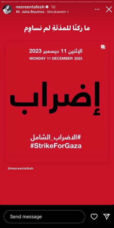 كانون الأول، للضغط من أجل وقف العدوان الإسرائيلي على القطاع في فلسطين، نشرت الممثلة السورية من اصل فلسطيني، نسرين طافش عبر خاصية القصص القصيرة على حسابها عبر انستغرام، صورة عبرت من خلالها عن تضامنها الكامل مع فلسطين، وارفقتها بأغنية للفنانة اللبنانية جوليا بطرس.