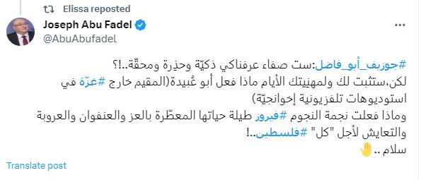 جوزيف أبو فاضل، انتقد من خلالها كلام صفاء سلطانـ اذ كتب: "ست صفاء عرفناكي ذكيّة وحذِرة ومحقّة!؟ لكن، ستثبت لك ولمهنِيتك الأيام ماذا فعل أبو عُبيدة (المقيم خارج القطاع في استوديوهات تلفزيونية إخوانجيّة)"، بحسب تعبيره.