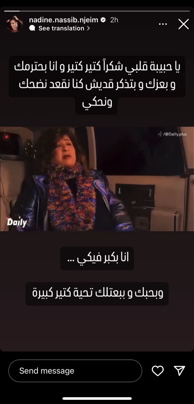 وتابعت نادين: "أنا بكبر فيكي... وبحبك وببعتلك تحية كتير كبيرة".