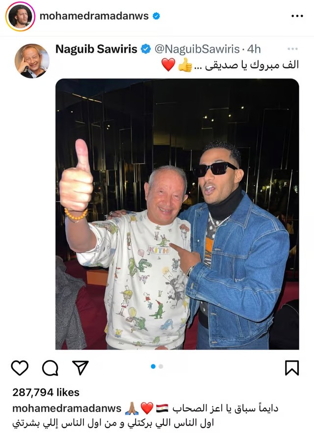 وفي التفاصيل، شارك محمد رمضان صورة تجمعه بساويرس على حسابه عبر "إنستغرام"، أرفقها بتعليق: "دايما سباق يا أعز الناس، أول الناس اللي باركت لي، وأول الناس اللي بشرتني".