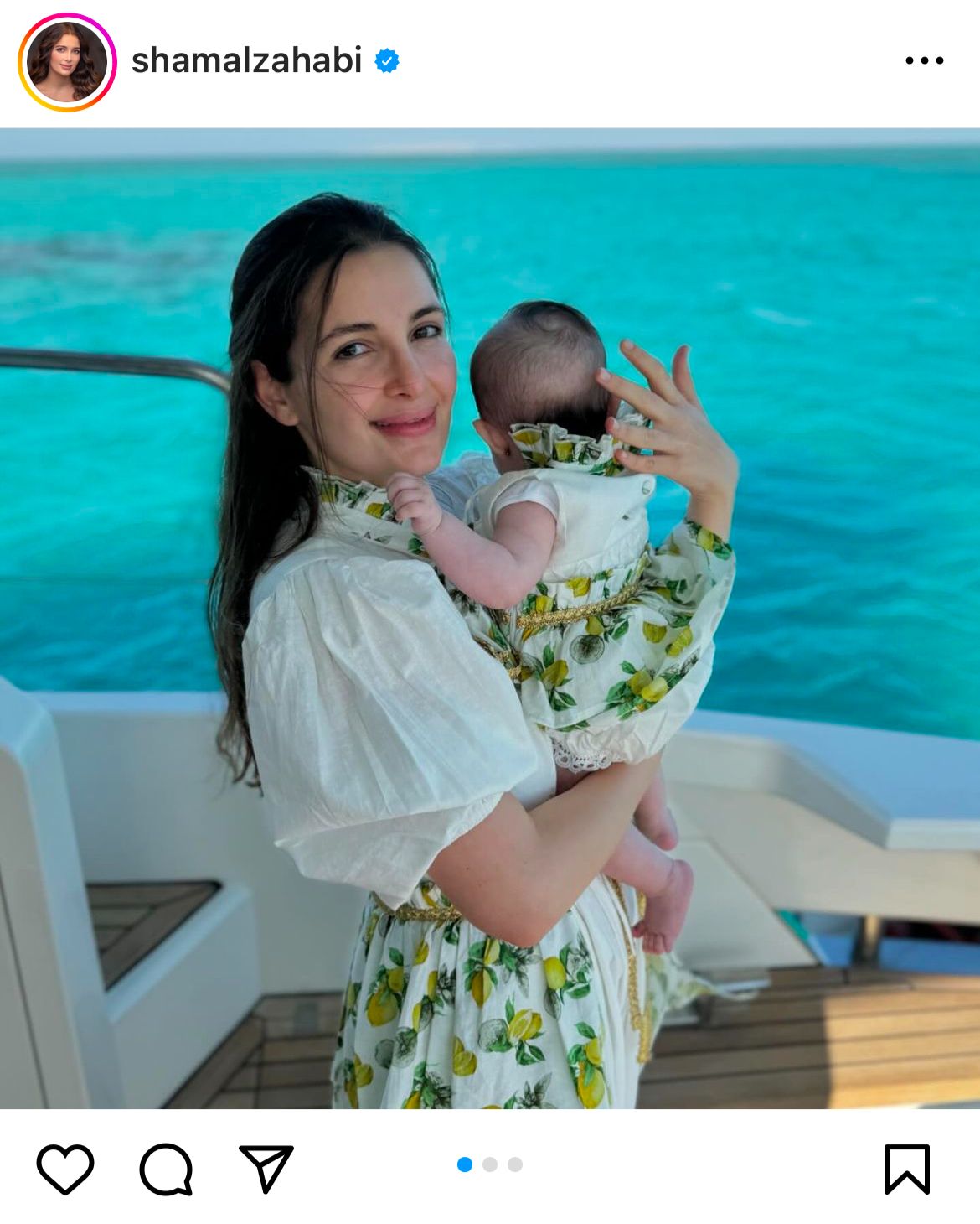 ونشرت شام صورتين تظهرها وهي تحمل طفلتها على متن قارب وسط البحر، وقررت إخفاء ملامحهما كالمعتاد، بينما أظهرت صورة ثالثة زوجها أحمد هلال.