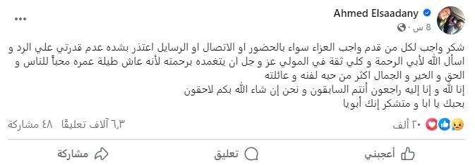 وفي التفاصيل، كتب أحمد السعدني الابن عبر حسابه الشخصي في موقع "فيس بوك"، في أول تعليق له: "شكر واجب لكل من قدم واجب العزاء، سواء بالحضور أو الاتصال أو الرسايل، أعتذر بشدة عن عدم قدرتي على الرد، وأسأل الله لأبي الرحمة".
