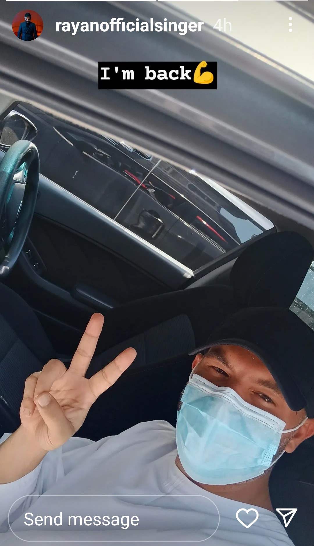 نشر الفنان اللبناني ريان، عبر خاصية القصص القصيرة على حسابه عبر انستغرام، صورة جديدة له ظهر فيها في السيارة عند خروجه من المستشفى، بعد إجرائه عملية استئصال كليته نتيجة إصابته بمرض السرطان.