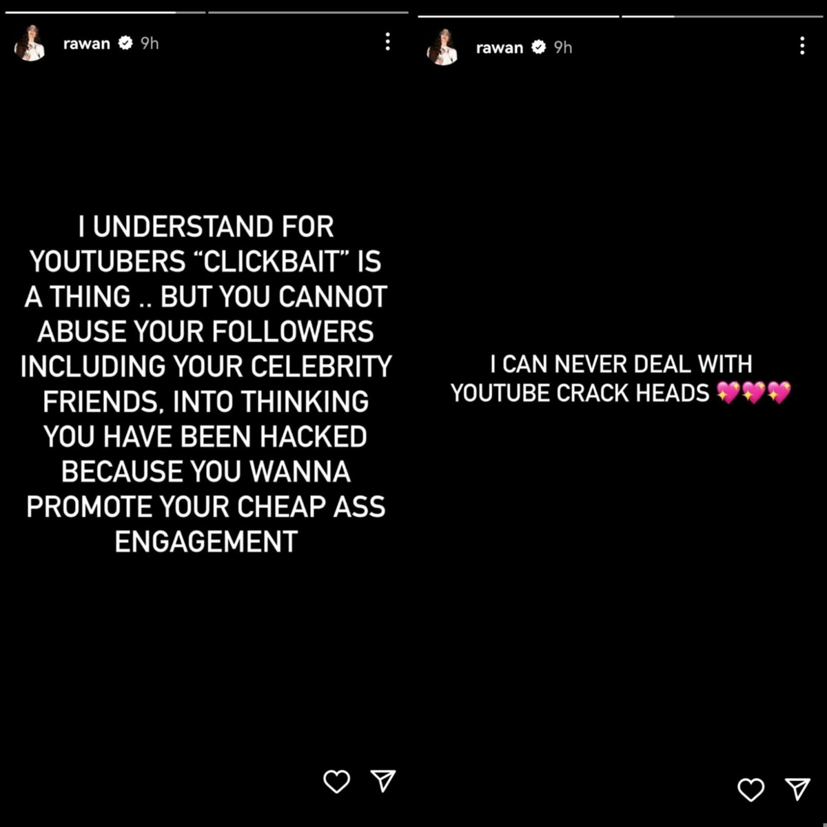 وفي التفاصيل، شاركت روانبن حسين عبر خاصية القصص القصيرة على حسابها عبر انستغرام تدوينةً كتبت فيها: أعرف أن "Clickbait" (نص رابط مصغر مصمم لجذب الانتباه وإغراء المستخدمين بالمتابعة، وعادةً ما يكون خادعًا، أو مثيرًا)، ولكن لا يمكن استغلال متابعيك بما في ذلك أصدقاؤك المشاهير، للاعتقاد بأنكِ تعرضتِ للاختراق، واصفةً ما حدث بـ "الترويج الرخيص".