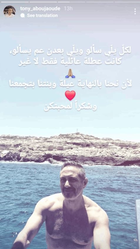 وفي التفاصيل، نشر طوني عبر خاصية القصص القصيرة على حسابه عبر انستغرام، صورة له ظهر فيها على البحر خلال استمتاعه بعطلته الصيفية، وارفق الصورة بتعليق قال فيه: "لكل يلي سألو ويلي بعدن عم يسألو كانت عطلة عائلية فقط لا غير"، مضيفا: "لأن نحنا بالنهاية عيلة وبنتنا بتجمعنا وشكرا لمحبتكن".