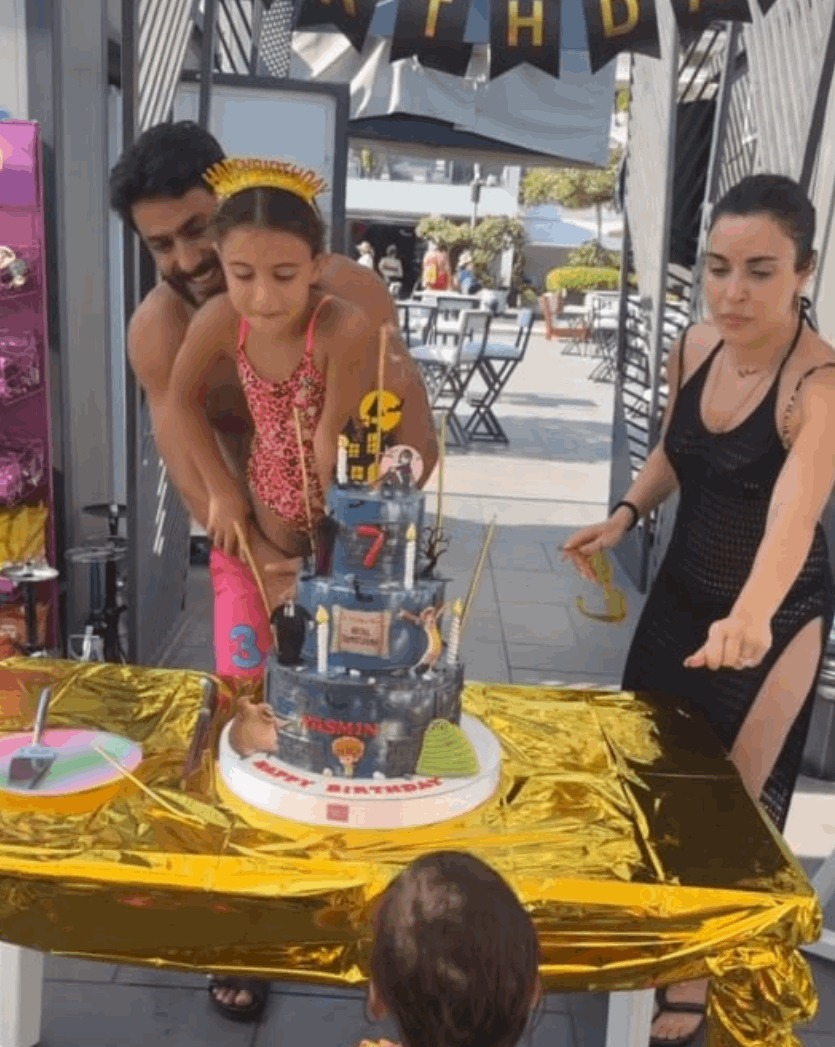 وبدت سارة سعيدة وعلى علاقة جيدة جدا بإبنة زوجها "ياسمين"، ولفت قالب الحلوى الضخم الأنظار، وتميز باللون الأزرق وعليه رقم 7، حيث يدل على عمر الطفلة.