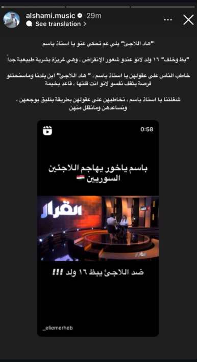 وأضاف الشامي وكتب: "خاطب الناس على عقولهن يا أستاذ باسم "هاد اللاجئ" ابن بلدنا وما سمحتلو فرصة يثقف نفسه لانو انت قلتها "قاعد بخيمة".