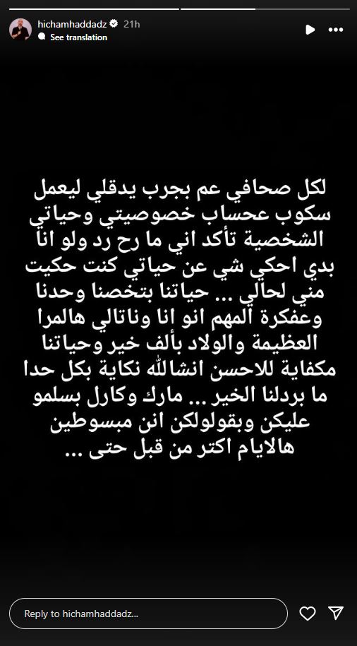 وفي التفاصيل، كتب هشام حداد في منشور عبر خاصية القصص القصيرة على حسابه عبر انستغرام: "لكل صحافي عم يجرب يدقلي ليعمل سكوب عحساب خصوصيتي وحياتي الشخصية، تأكد اني ما رح رد، ولو انا بدي احكي شي عن حياتي كنت حكيت مني لحالي".