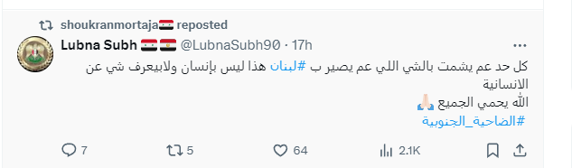 من جهتها، قامت شكران مرتجى بإعدة نشر بوست على حسابها جاء فيه: "كل حدا عم يشمت بالشي اللي عم يصير ب #لبنان هذا ليس بإنسان ولابيعرف شي عن الانسانية الله يحمي الجميع."