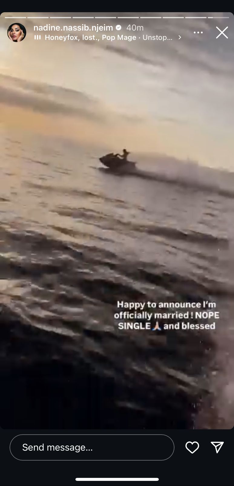 وفي التفاصيل، أعلنت نادين خبر انفصالها عن خطيبها رجل الاعمال السوري ناريغ ناربيكيان، من خلال فيديو نشرته عبر حسابها على انستغرام وهي على البحر وعلقت: " يسعدني أن أعلن أنني متزوجة رسميًا! لا، أنا عزباء وممتنة".