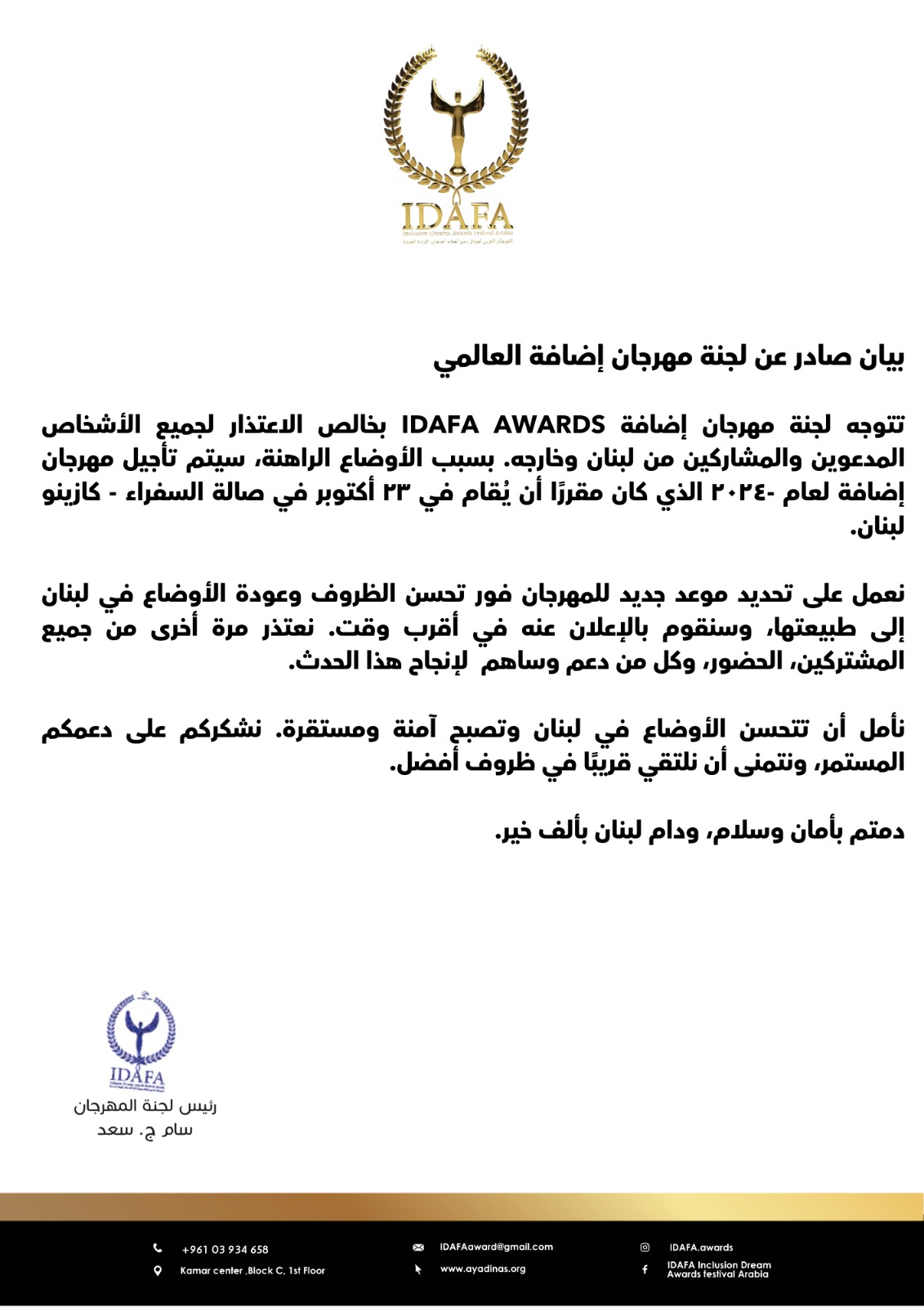 أصدر الإعلامي والمخرج سام سعد، مؤسس ورئيس مهرجان "Idafa Awards" بيانا حول ​تأجيل حفل توزيع الجوائز على المبدعين من أصحاب الهمم والإرادة الصلبة، والذي كان من المقرر إقامته يوم غد الأربعاء 23 أكتوبر/تشرين الأول في كازينو لبنان، وذلك بسبب الظروف الصعبة التي يعيشها لبنان.