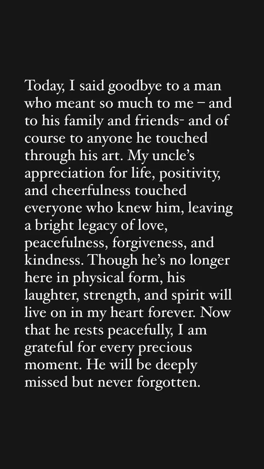 وأضافت في رسالتها التي شاركتها باللغة الإنجليزية كاتبةً بما معناه: إن تقدير عمي للحياة والإيجابية والبهجة التي تحلى بهما انعكس على كل من عرفه، تاركاً إرثاً مشرقاً من الحب والسلام والتسامح والطيبة.. وعلى الرغم من أنه لم يعد موجوداً بجسده ولكن ضحكته وقوته وروحه ستعيش في قلبي إلى الأبد.