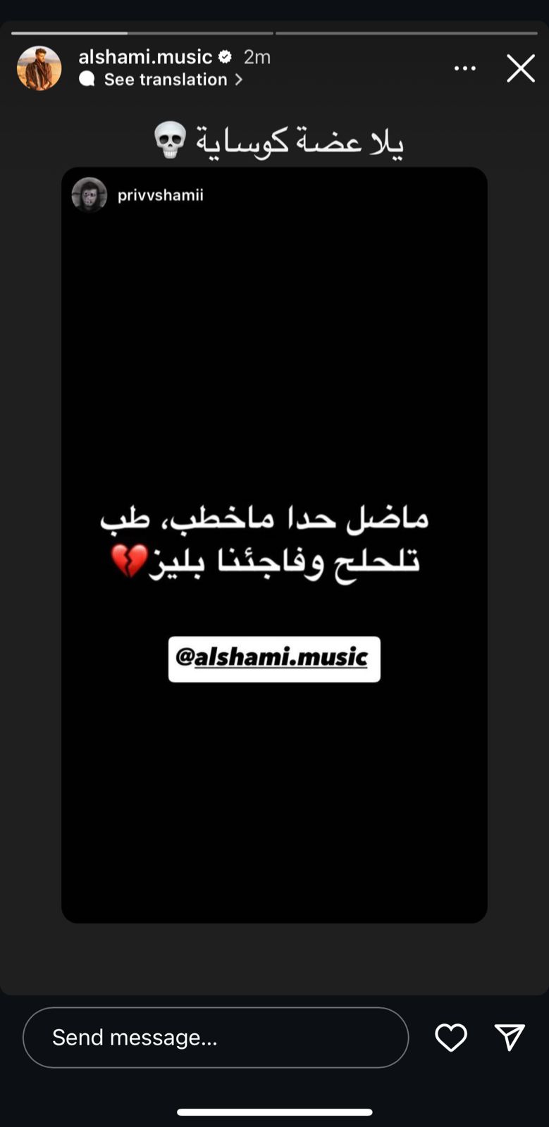 من هنا، سارع الشامي في الرد على المتابع، اذ أعاد نشر السؤال عبر خاصية القصص القصيرة على حسابه عبر انستغرام، وارفقه بالتعليق التالي: "يلا عضة كوساية"، الامر الذي اعتبره المتابعون ان الشامي يلمح الى قرب موعد خطوبته ويحاول إيصال