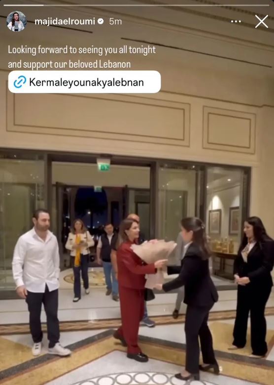 وكتبت ماجدة على الفيديو الذي ظهرت فيه، وهي تستلم باقة من الزهور من المستقبلين: نتطلع إلى رؤيتكم جميعًا الليلة، ودعم لبنان الحبيب.