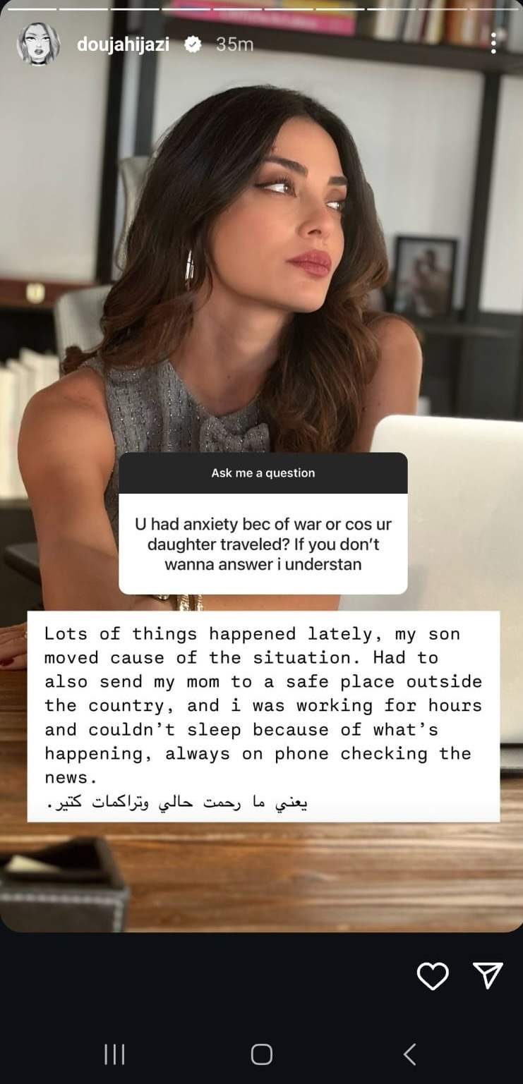 وفي التفاصيل، أضافت حجازي ردّاً على أحد متابعيها الذي سألها عن سبب قلقها في الفترة الأخيرة، أنّها كانت تعمل لساعات ولم يكن بإمكانها النوم بسبب ما يحدث، وأنّها تُتابع الأخبار على هاتفها باستمرار، وختمت قائلة: "يعني ما رحمت حالي وتراكمات كتير".