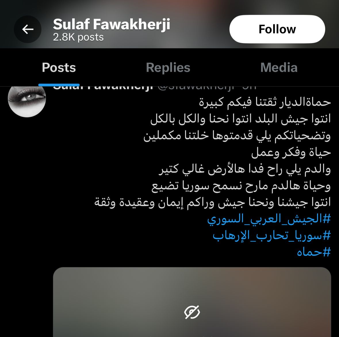 وفي تعليقها على ما يحصل، كتبت الفنانة السورية سلاف فواخرجي تغريدة على حسابها عبر منصة "اكس"، عبرت فيها عن تضامنها مع الجيش السوري: "حماة