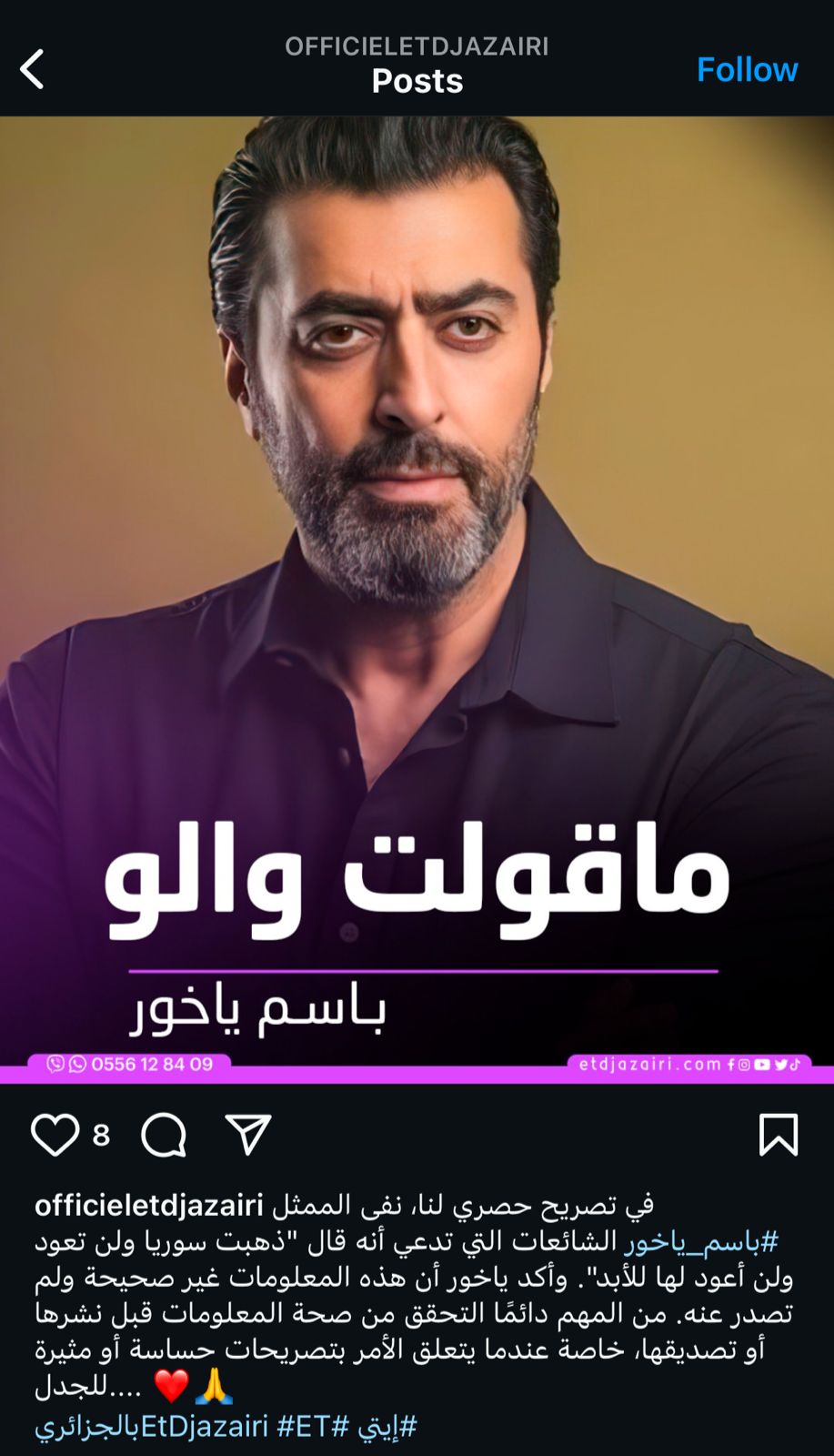 وأكد ياخور في تصريح لـ ET بالجزائري أن هذه المعلومات غير صحيحة ولم تصدر عنه.