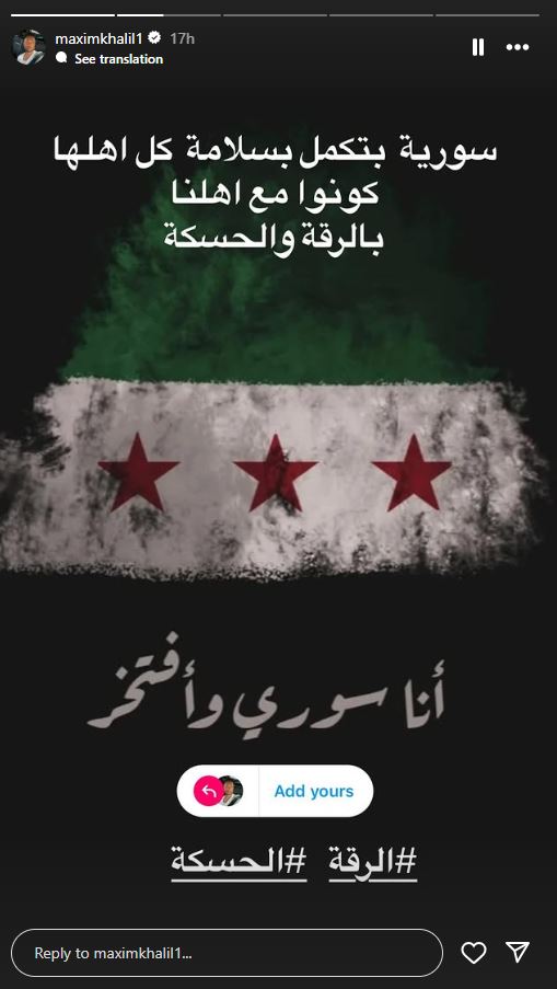 سوريا بتكمل بسلامة كل أهلها.. كونوا مع أهلنا بالرقة والحسكة"، مضيفا: "انا سوري وافتخر".