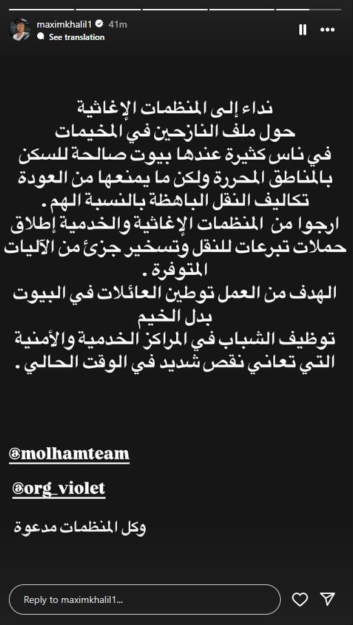 مكسيم خليل: "نداء الى المنظمات الاغاثية حول ملف النازحين في المخيمات، في ناس كثيرة عندها بيوت صالحة للسكن بالمناطق المحررة ولكن ما يمنعها من العودة تكاليف النقل الباهظة بالنسبة لهم".