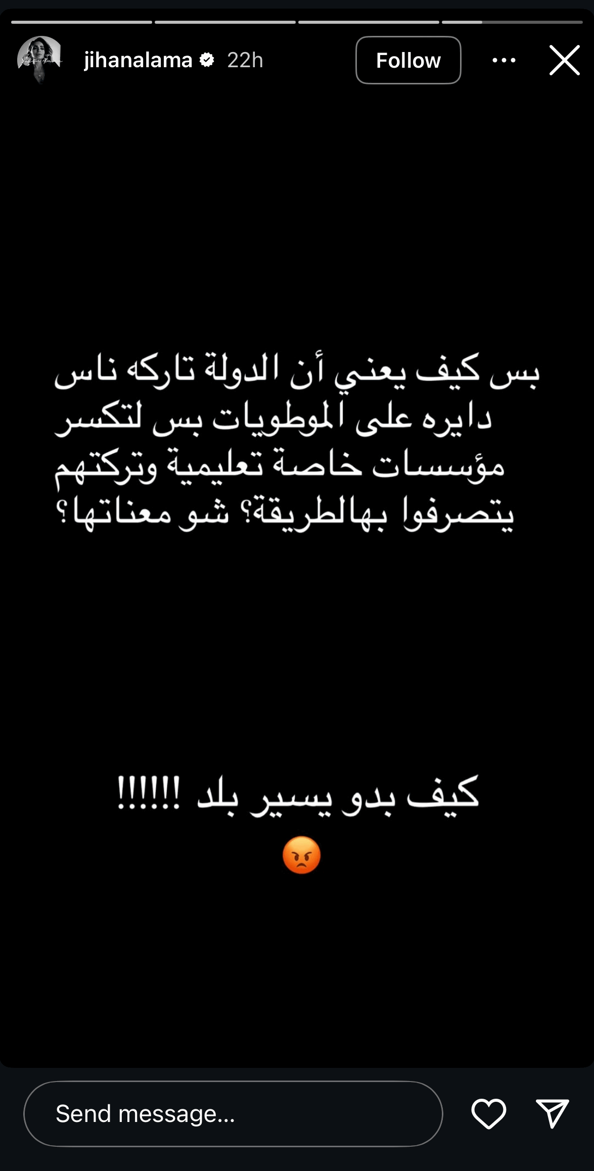 وفي التفاصيل، فقد قالت جيهان من خلال خاصية الستوري شاركتها عبر حسابها على " انستغرام: " بس كيف يعني أن الدولة تاركة ناس دايرة على الموتويات بس لتكسر مؤسسات خاصة تعليمية و تركتهم يتصرفوا بهالطريقة؟ شو معناتها؟ كيف بدو يصير بلد !!! ".