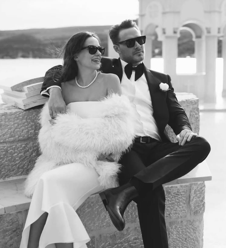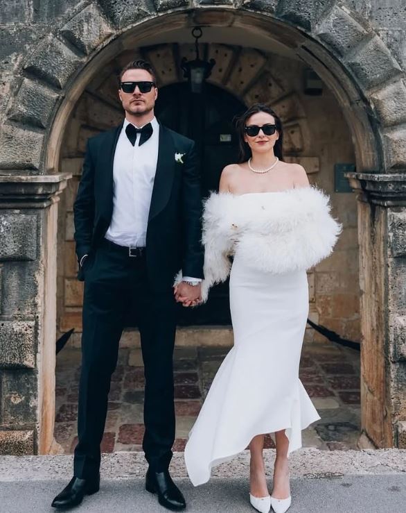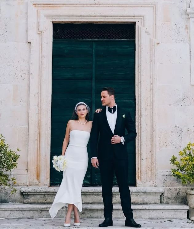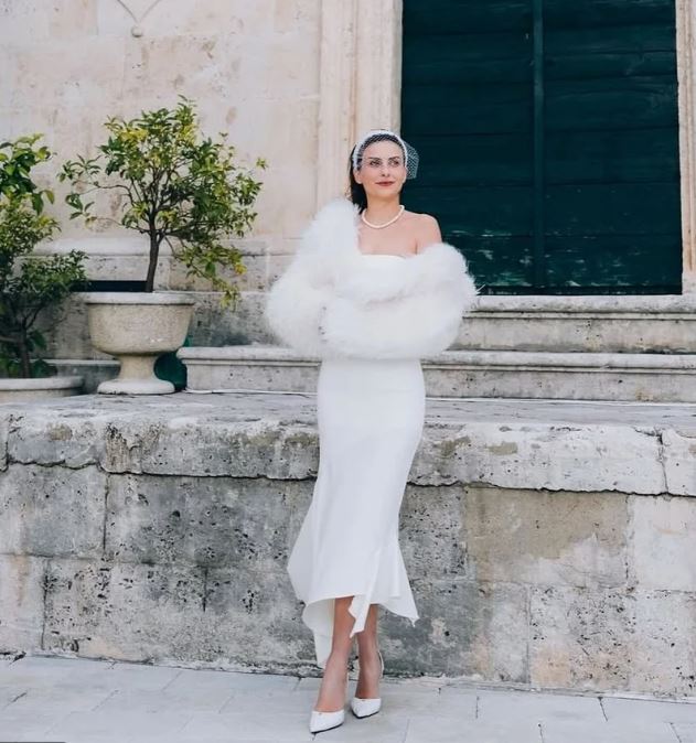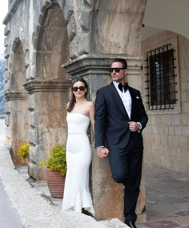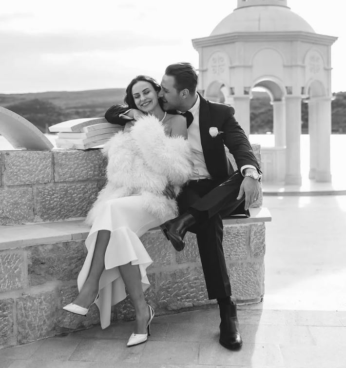 توم فورد"، عكست بساطته ورقيه، بينما تألقت العروس إيجِه بفستان زفاف من تصميم علامة "إيلا"، تميز بصيحة أوف شولدر البسيطة بدون تطريز، ما أضفى عليها جمالاً طبيعياً ونعومة فائقة، وأكملت إطلالتها بشعر منسدل بانسيابية، وفي بعض الصور أضافت شالاً من الفرو