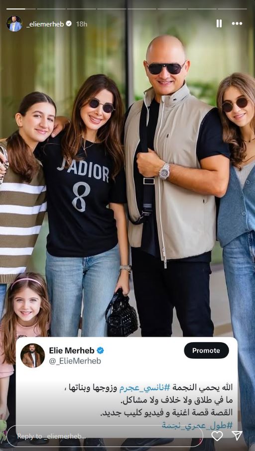 نانسي عجرم، اذ نشر عبر خاصية القصص القصيرة على حسابه عبر انستغرام، صورة لـ نانسي مع زوجها وبناتها، وارفقها بالتعليق التالي: "