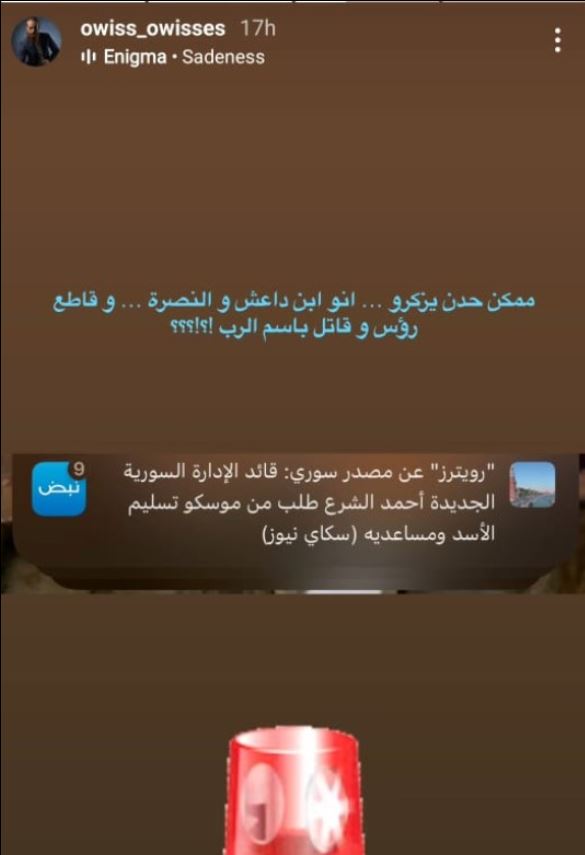 موسكو تسليم الأسد ومساعديه"، فعمد اويس الى نشره عبر خاصية القصص القصيرة على حسابه عبر انستغرام، وارفقه بالتعليق التالي: "ممكن حدا يذكره.. انه ابن