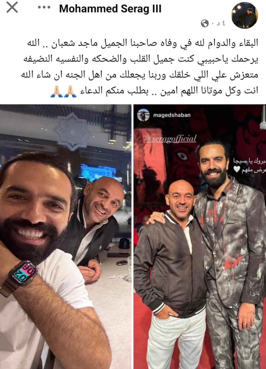 ونعى عدد من المشاهير في مصر الراحل ومنهم محمد سراج، الذي كتب عبر فيسبوك: "البقاء والدوام لله في وفاه صاحبنا الجميل ماجد شعبان.. الله يرحمك يا حبيبي كنت جميل القلب والضحكة والنفسية النضيفة متعزش علي اللي خلقك وربنا يجعلك من اهل الجنة ان شاء الله انت وكل موتانا اللهم امين .. بطلب منكم الدعاء".