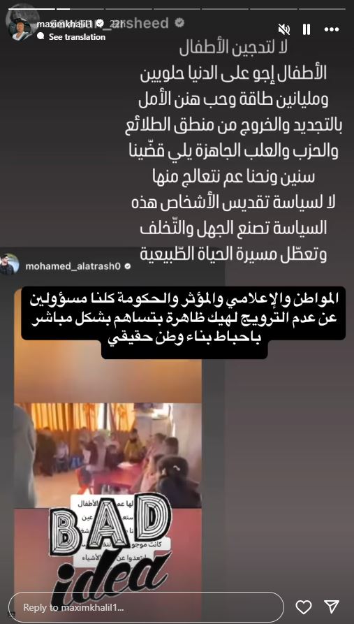 وبدوه أعاد مكسيم ما قالته سوسن و أضاف عليه: "المواطن و الإعلامي والمؤثرة والحكومة.. كلنا مسؤولين عن عدم الترويج ليهك ظاهرة بتساهم بشكل مباشر باحباط بناء وطن حقيقي".