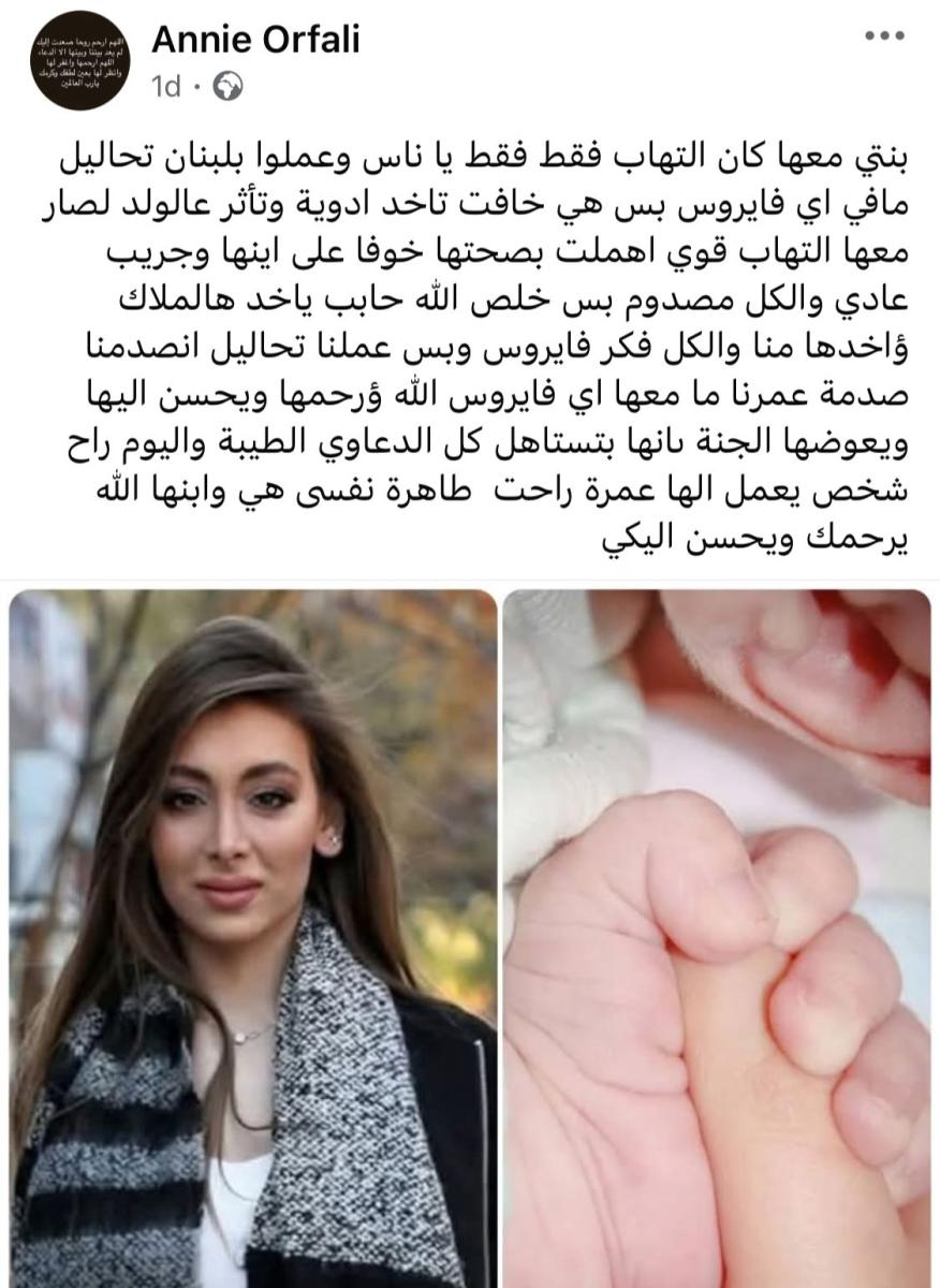 تابعت : "اهملت بصحتها خوفا على ابنها وجريب عادي والكل مصدوم بس خلص اللّٰه حابب ياخد هالملاك واخدها منا ".