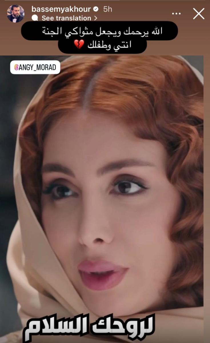 ونعى باسم ياخور اليوم صديقته في مسلسل "حرملك" و "بقعة ضوء" عبر صفحته الشخصية في منصة "انستغرام"، إذ شارك صورتها وأرفقها بتعليق قال فيه: "الله يرحمك ويجعل مثواكي الجنة إنتي وطفلك"، مع إضافته إيموجي القلب المكسور".