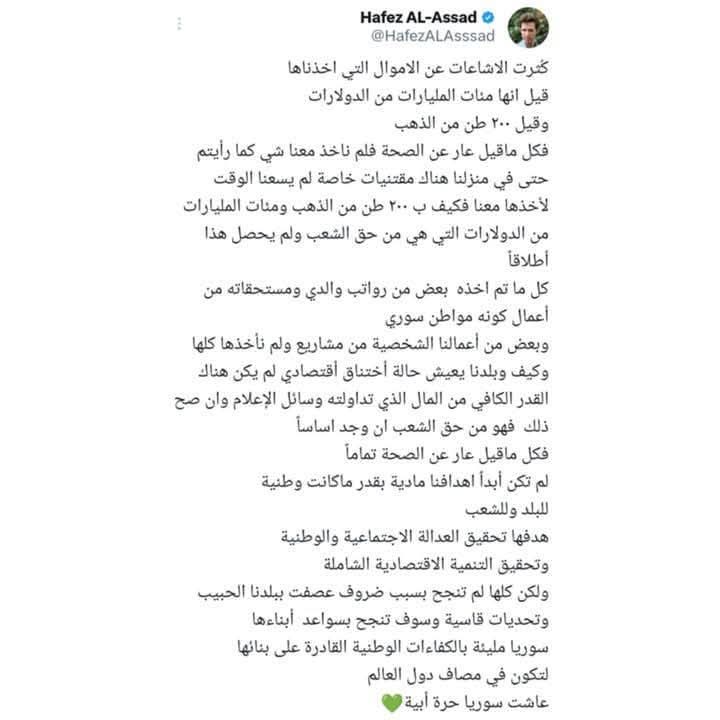 وأضاف: "كل ما تم أخذه بعض من رواتب والدي ومستحقاته من اعمال كونه مواطن سوري، وبعض من أعمالنا الشخصية من مشاريع ولم نأخذها كلها وكيف وبلدنا يعيش حالة اختناق اقتصادي لم يكن هناك القدر الكافي من المال الذي تداولته وسائل الإعلام وإن صح ذلك فهو من حق الشعب إن وجد أساساً".