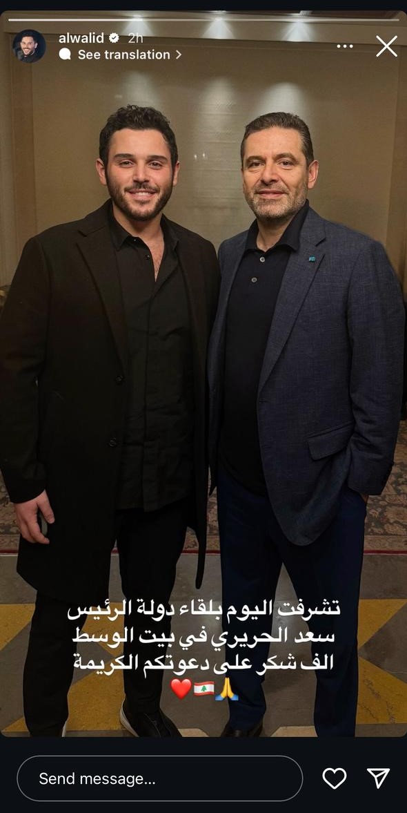 شارك الفنان اللبناني الوليد الحلاني الجمهور صورة برفقة رئيس الحكومة اللبناني السابق سعد الحريري من بيت الوسط، وذلك عبر خاصية القصص القصيرة عبر حسابه الخاص.