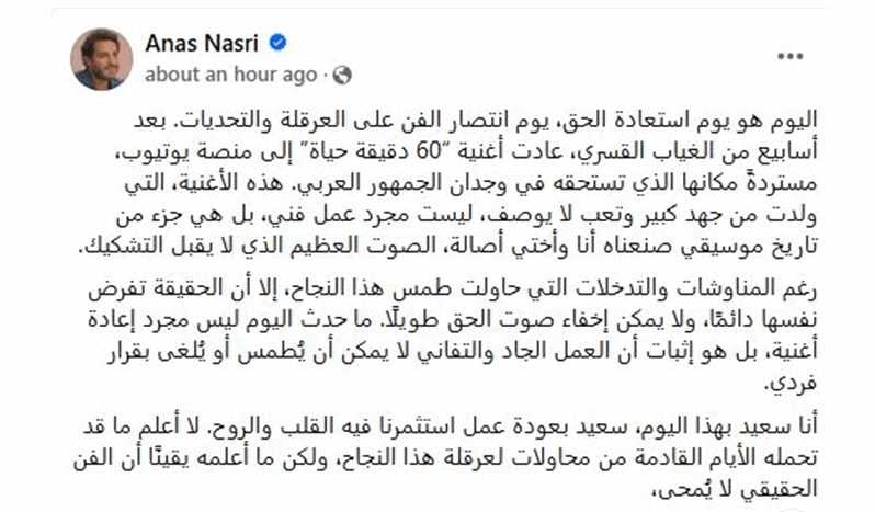 كتب أنس نصري عبر حسابه بموقع Facebook: "اليوم هو يوم استعادة الحق، يوم انتصار الفن على العرقلة والتحديات. بعد أسابيع من الغياب القسري، عادت أغنية “60 دقيقة حياة” إلى منصة يوتيوب، مستردةً مكانها الذي تستحقه في وجدان الجمهور العربي. هذه الأغنية، التي ولدت من جهد كبير وتعب لا يوصف، ليست مجرد عمل فني، بل هي جزء من تاريخ موسيقي صنعناه أنا وأختي أصالة، الصوت العظيم الذي لا يقبل التشكيك".