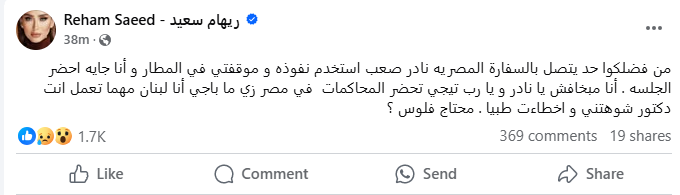 وناشدت ريهام السفارة المصرية التدخل، حيث كتبت على صفحتها الخاصة عبر فيسبوك: "من فضلكوا حد يتصل بالسفارة المصريه نادر صعب استخدم نفوذه و موقفتي في المطار و أنا جايه احضر الجلسه . أنا مبخافش يا نادر و يا رب تيجي تحضر المحاكمات  في مصر زي ما باجي أنا لبنان مهما تعمل انت دكتور شوهتني و اخطاءت طبيا . محتاج فلوس؟".