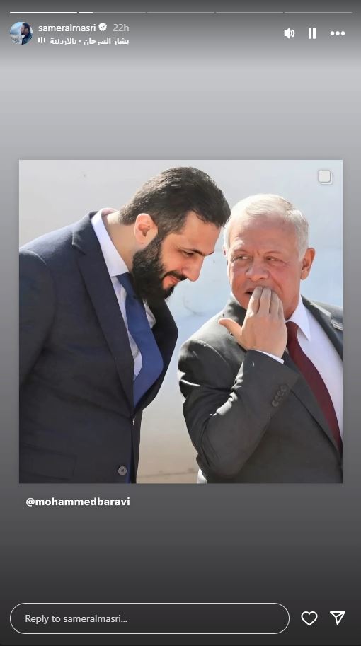 سامر المصري الصورة بأغنية: "بالاردنية"، تعبيرا منه عن سعادته وفخره بلقاء الرئيس السوري وملك الأردن، لما في هذا اللقاء خير لمصلحة البلدين، بوجود الرئاسة الجديدة بعد سقوط نظام بشار الأسد.