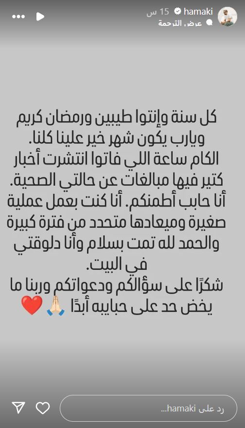 وقال حماقي: "كل سنة وأنتم طيبين ورمضان كريم، يارب يكون شهر خير علينا كلنا. الكام ساعة اللي فاتوا انتشرت أخبار كتير فيها مبالغات عن حالتي الصحية".