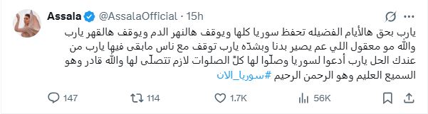 وفي اول تعليق لها على ما يحصل، نشرت الفنانة السورية اصالة نصري على حسابها عبر منصة "اكس"، تغريدة قالت فيها: "يا رب بحق هالأيام الفضيلة تحفظ