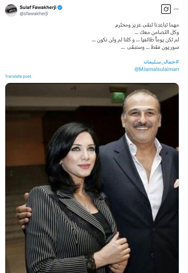 وفي التفاصيل، نشرت سلاف على حسابها عبر منصة "اكس"، صورة جمعتها بـ جمال سليمان، وارفقتها بالتعليق التالي: "مهما تباعدنا تبقى عزيز ومحترم وكل التضامن معك".
